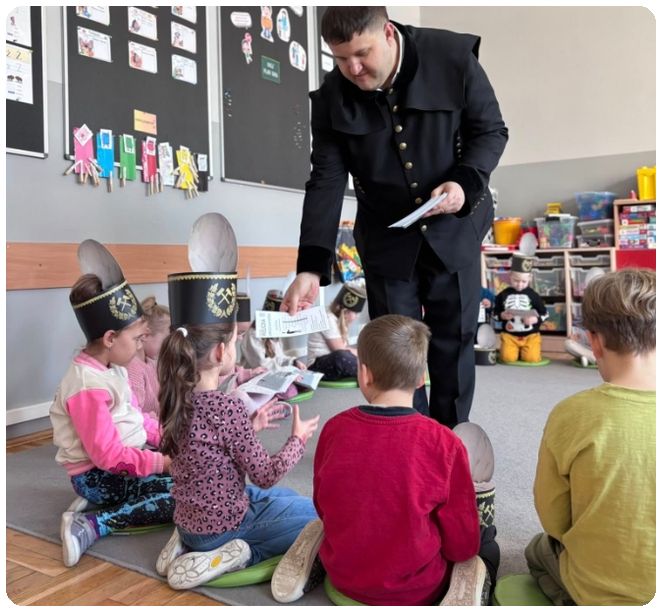 W tym tygodniu odwiedził nas prawdziwy Górnik z Kopalnia Soli „Wieliczka”, który opowiadał dzieciom o swojej pracy, pokazał górnicze czako oraz przybliżył legendę o św. Kindze. Dzieci były zachwycone i z ogromnym zaciekawieniem brały udział w zajęciach!