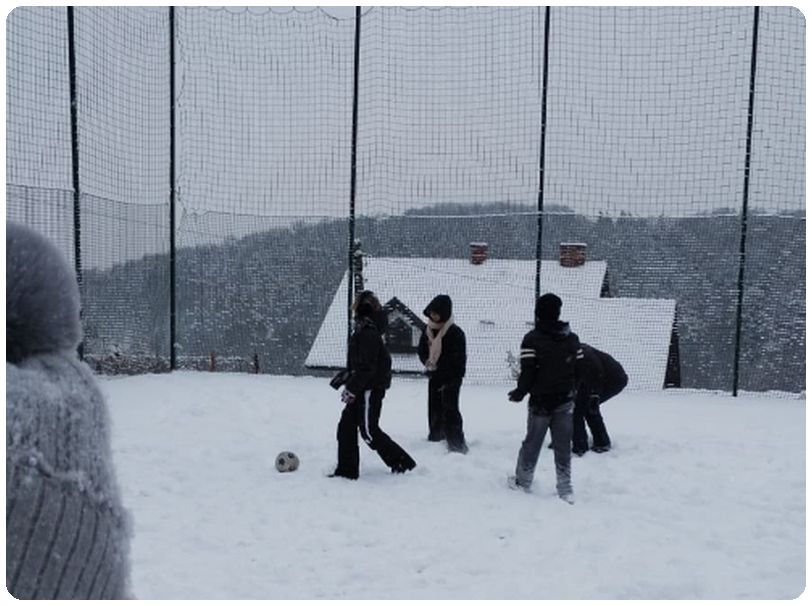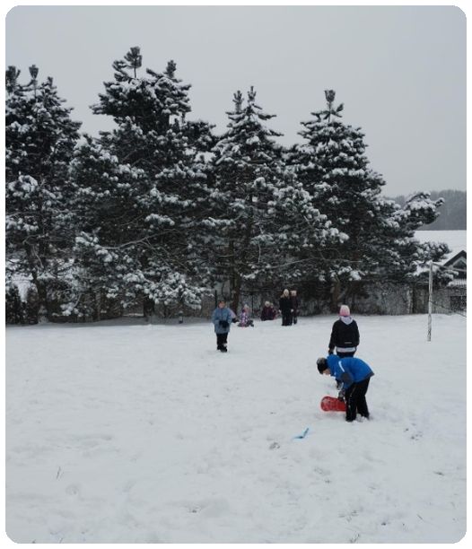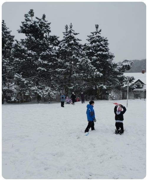 A tymczasem w szkole zupełnie inny obraz – dzieci na śniegu, na polu, radość, śmiech i świetna zabawa.