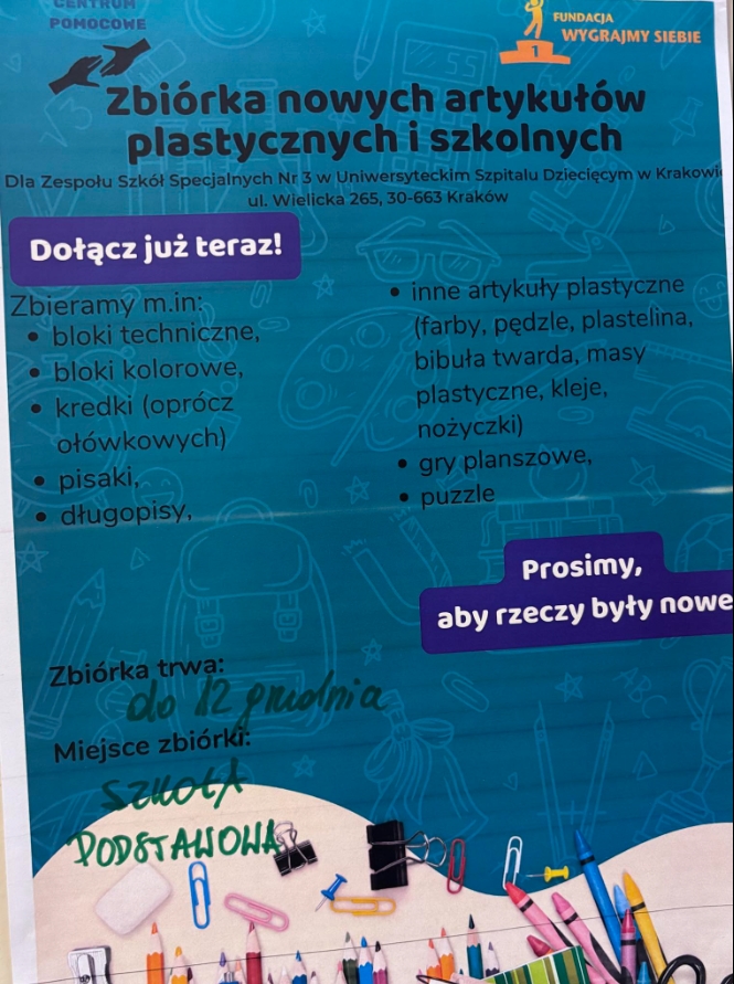 Zapraszamy całą naszą społeczność szkolną i przedszkolną do włączenia się w kolejną akcję charytatywną na rzecz Zespołu Szkół Specjalnych Nr 3 w Uniwersyteckim Szpitalu Dziecięcym w Krakowie.